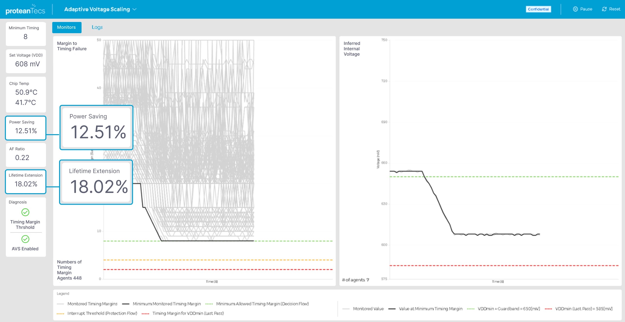 proteanTecs AVS Pro continuously adjusts voltage based on real-time Agent data. As the device operates with a surplus of timing margin, AVS Pro reduces the voltage. When more stressful functional workloads operate or degradation reduces timing margins, AVS Pro increases the voltage only as much as needed to maintain safe operation.